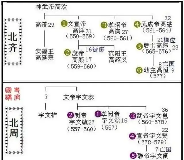 当北齐的高氏家族在作妖的路上不断花样翻新的时候,关中的宇文泰家族却稳定发展逐渐壮大,公元557年他们取代了西魏,建立了北周 20年之后北周再次入侵北齐,这一回创造邙山大捷的那几位主将都不在世了,北周军队势如破竹,一举拿下了晋阳和邺城,北齐灭亡。北齐这个奇葩的王朝存在了短短27年,亡国最主要的原因就是疯狂的皇室一家,家族企业董事会全都疯了,而且是那种极其变态的疯法,那你说公司还有什么指望呢。这是一个有严重精神病遗传史的家族,这样的家族里即使出几个高长恭这样的人才也是枉然。另外也得提一句,北齐皇室的变态和胡作,主要是在统治阶层当中制造混乱,还没有害民的那种重大的恶政,所以北周灭齐,隋又取代北周之后,立刻就能够集中起优势的人力物力灭陈,统一华夏,说明北齐皇室胡作非为这27年,民生和的中下层还基本保持完好。